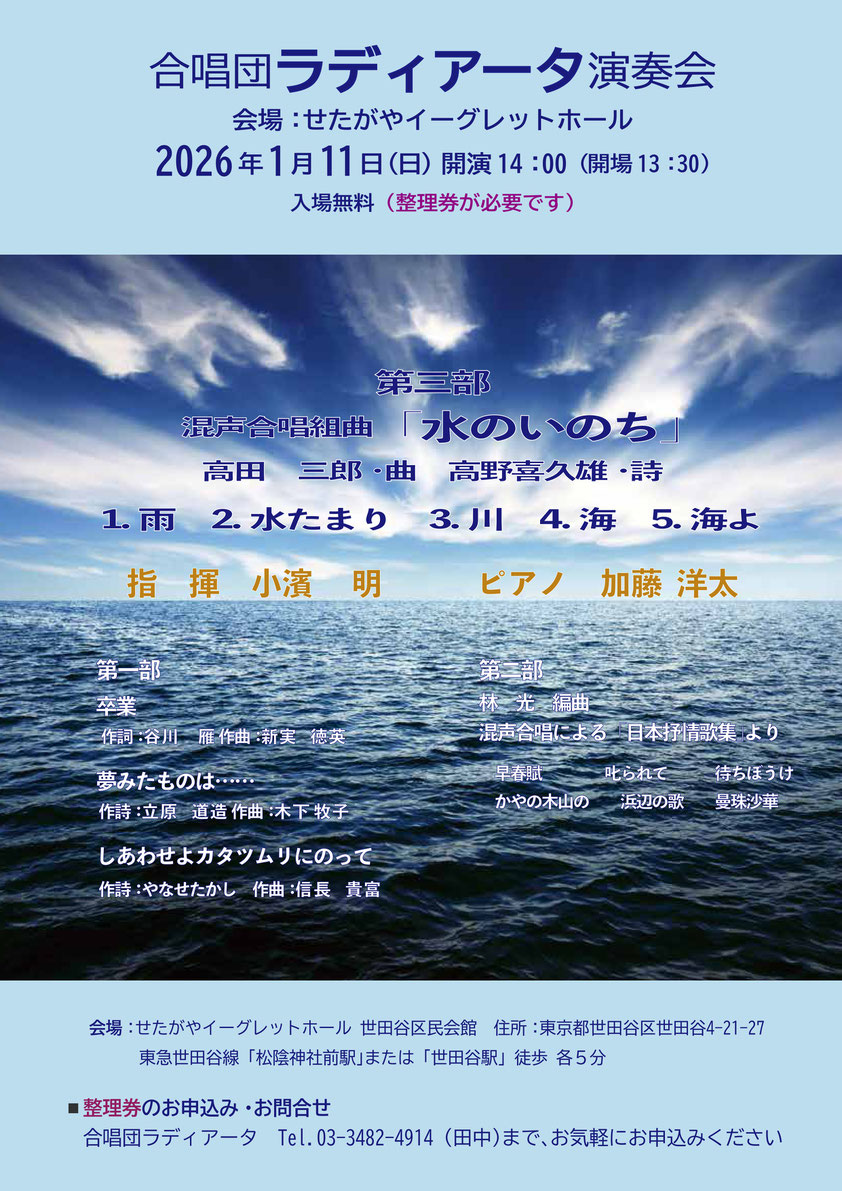 合唱団ラディアータによる演奏会が、新年 2026年 1月11日(日)に開催されます。